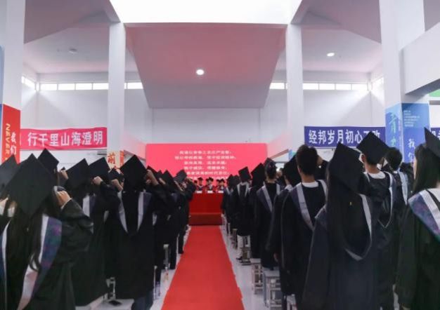 在庄严的乐曲声中,全体毕业生在毕业生代表郭鹏鹏的带领下庄严宣誓:“铭记母校教诲,坚守校训精神;崇尚真理,追求卓越;恪守诚信,明德修身;心系家国勇担时代责任;以奋斗铸就青春,以行动报效祖国!”铿锵誓言,彰显青春担当。