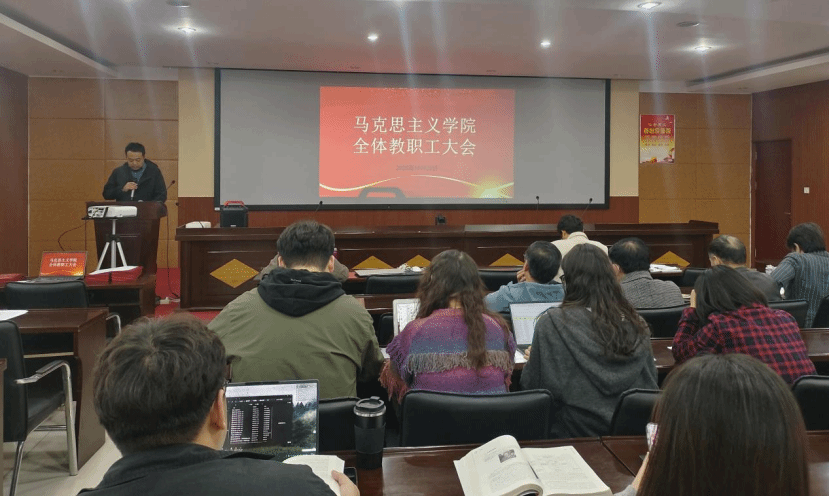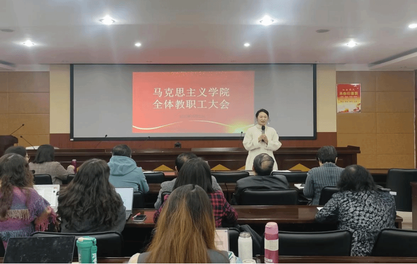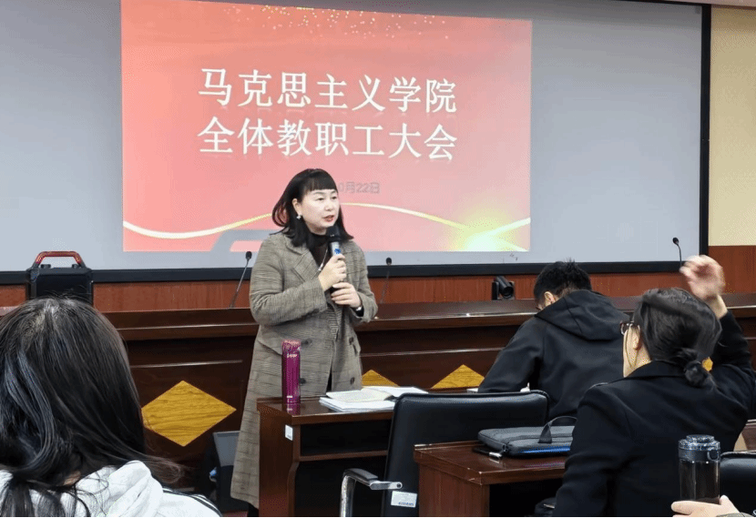 党总支书记周晓东首先对学院近期在教学、科研、学生管理等核心领域取得的成绩进行梳理,用一系列“亮眼”成果提振全体教职工的信心。同时,他结合学院发展实际和2025年本科教育教学审核评估工作要求,围绕课堂教学质量提升、教学科研深度融合、教风学风协同建设等问题对学院下阶段重点工作进行规划。副院长刘晓燕以“学文件、明方向、补短板、提质量”为核心主线,带领全体教师深入学习解读学校及教育部相关文件精神,系统明确学院下一阶段工作安排,同时直面不足、鼓舞士气,为推动学院教学质量再上新台阶提供行动指南。副院长宋文芳从教学分工细化、教学材料规范、自编教材建设等方面对近期教学工作作出详实规划安排,为提升教学质量、夯实评建基础提供具体指引。党总支副书记付国花聚焦“三全育人”核心目标,结合对学生培养的要求,针对学生管理工作中的关键环节进行重点强调,如通过强化导师作用,构建更精准、更深入的学生成长指导体系等。