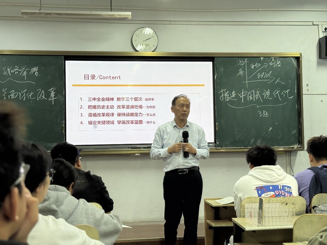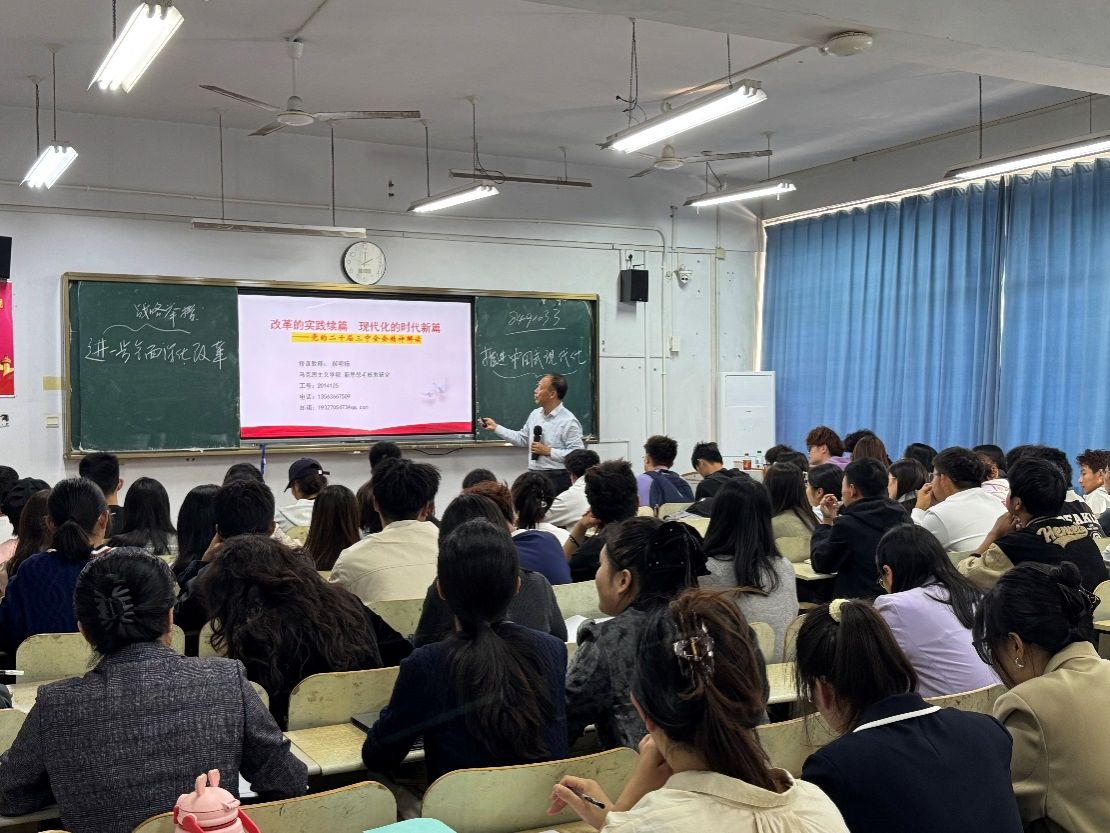 党的二十届三中全会,是在以中国式现代化全面推进强国建设、民族复兴历史伟业的关键时刻召开的重要会议。为深入学习宣传贯彻党的二十届三中全会精神,推动学院师生深刻认识进一步全面深化改革、推进中国式现代化的重要意义,10月16日下午,milan米兰体育官网毛泽东思想和中国特色社会主义理论体系概论教研室、习近平新时代中国特色社会主义思想概论教研室、形势与政策教研室全体教师共同学习二十届三中全会精神专题课。郝明杨教授以“改革的实践续篇 现代化的时代新篇”为主题对党的二十届三中全会精神进行解读。