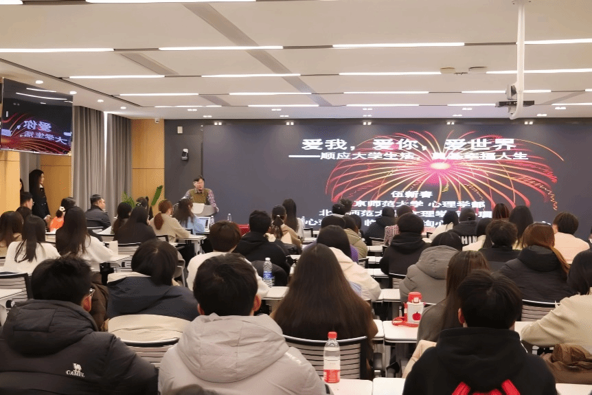 仪式第四项,北京师范大学心理学部的伍新春教授为在场师生呈现了一场关于“爱与幸福人生”的精彩专题讲座。伍教授深入浅出地探讨了心理健康教育的特征及其重要性,并就如何在学科体系中强化心理健康教育的建设提出了建议。他从理论和实践两个维度出发,分享了最新的研究成果和有效的干预策略。伍教授还着重指出,心理健康教育应致力于增进大学生的幸福感,聚焦于幸福素质的培养,并为规划大学生活提供指导。结合其多年的研究心得和实际案例,伍教授为师生们带来了一场思想激荡的学术盛宴。