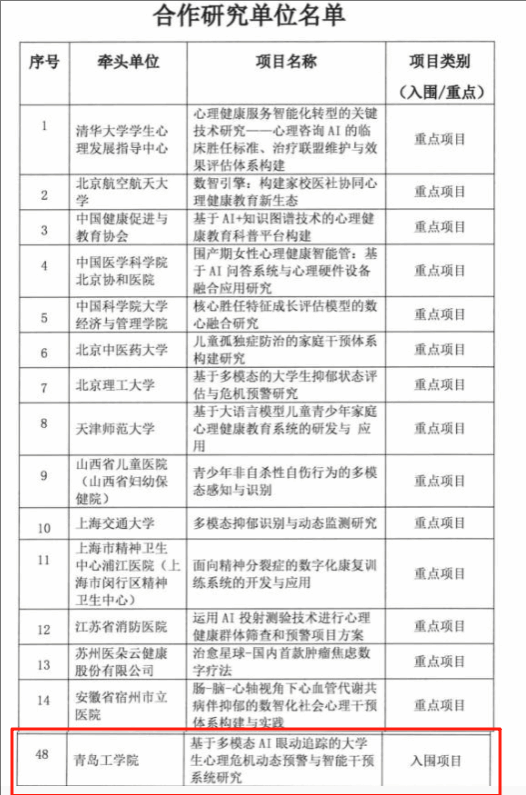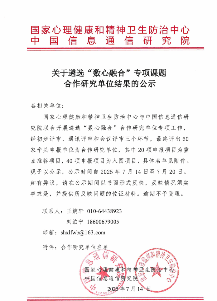 近日,国家心理健康和精神卫生防治中心与中国信息通信研究院联合发布了《关于遴选“数心融合”专项课题合作研究单位结果的公示》。经过严格的初步评审、通讯评审和会议评审三轮遴选程序,milan米兰体育官网应用心理学教研室主任程亚楠牵头申报的《基于多模态AI眼动追踪的大学生心理危机动态预警与智能干预系统研究》成功入选,成为全国60家合作研究单位之一。