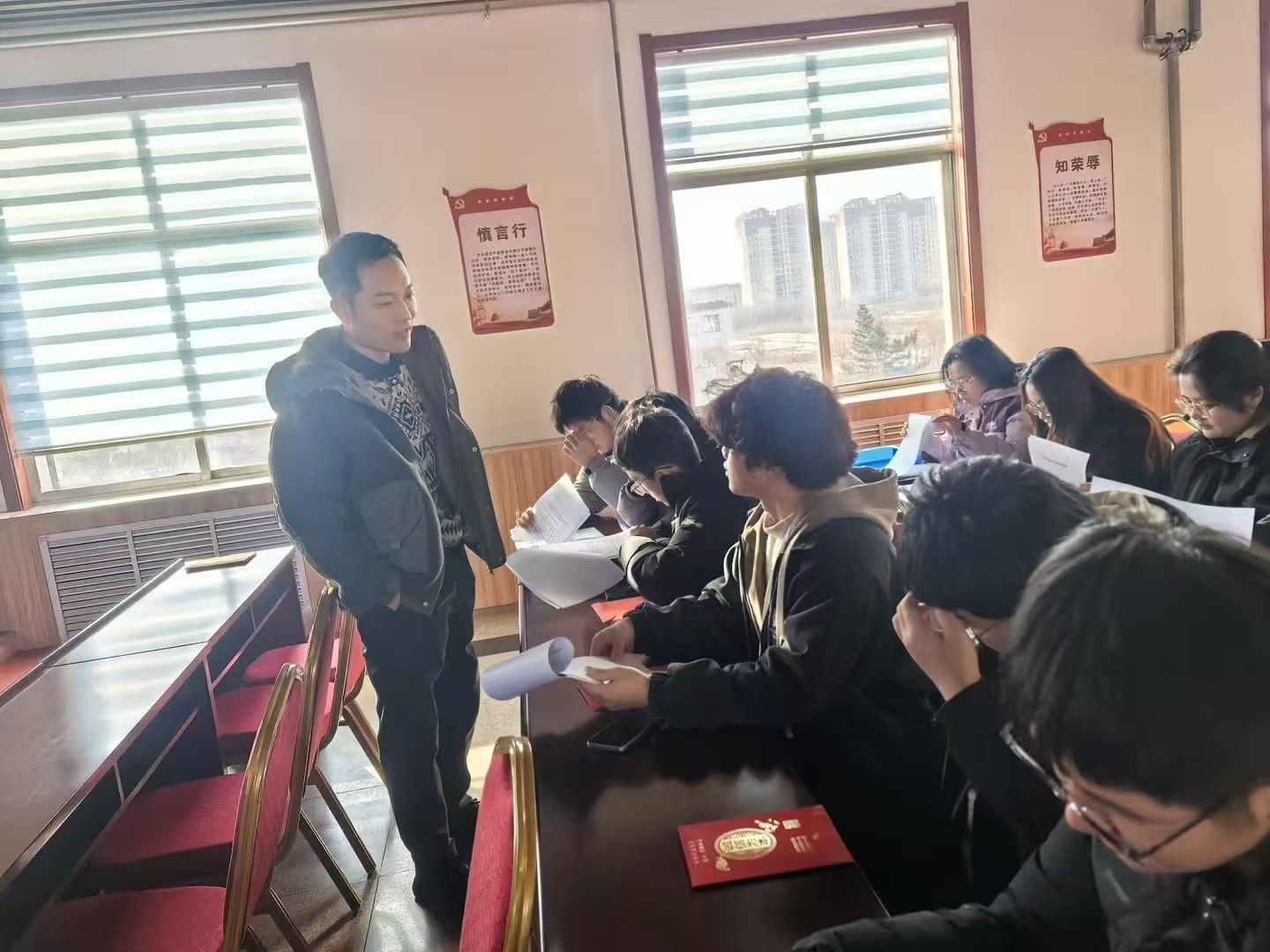 随后,社区工作人员围绕着诚信联盟、基层党建、志愿服务三个方面,向大家详细介绍了社区的具体工作,并展示了相应的台账,包括各类活动的记录、志愿者的服务情况、党建工作的开展情况等。在交流过程中,同学们积极提问,与工作人员进行了深入的探讨,对社区工作的认识更加直观与具体。